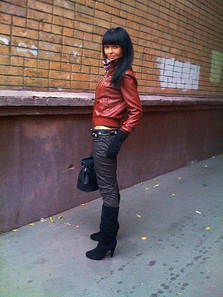 Милая красавица одела красную кожаную куртку, личико только не видно. Издали похожа на какую-то мотоциклистку, но если судить по моде то она ушла от нее далеко. Сейчас конечно же, она идет пешком.