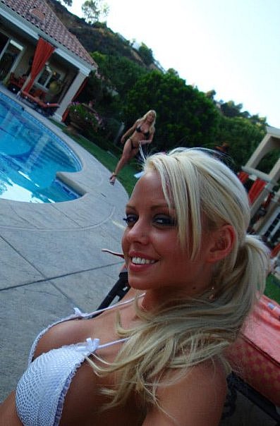 Обворожительная супер модель стоит и улыбается у бассейна, и сейчас ей хочется выпить апельсинового сока и угостить своих подруг. На улице как всегда хорошая погода, после бассейна девушки пойдут гулять на улицу.