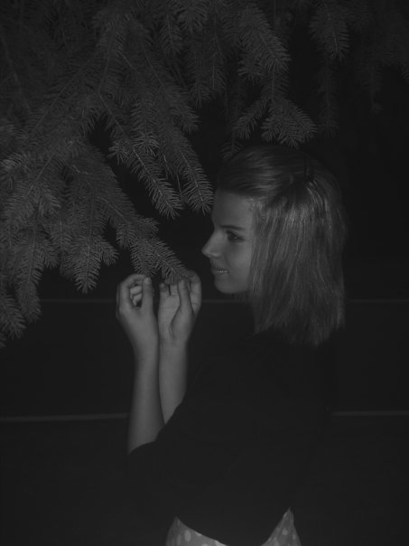 Девушка стоит у елки, она либо заблудилась. либо кого-то ждет, ведь встретиться с другом в лесу ночью - очень романтично. Как говорят - темнота друг молодежи.