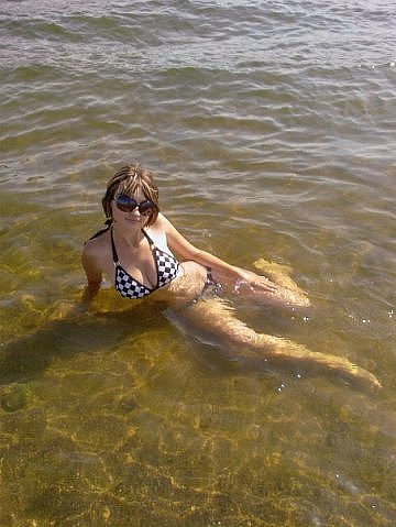 Молоденькая девушка купается в море, а на ней одет ска купальник в клеточку. Чтобы солнце не жгло глаза, пришлось одеть темные очки. Водичка теплая и прозрачная, видно даже как там плавает рыба.