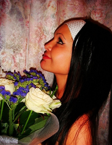 Девушка с синими цветами смотрит куда-то вверх, у нее милое личико и очаровательные накрашенные глазки. Скорее всего девушка собралась на свадьбу к своей подруге.