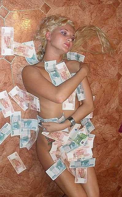 Девушка купается в деньгах, на ней пятитысячные купюры, доллары, евро, наверно целый миллион! Откуда у нее взялись такие деньги, разве что муж подарил за особые заслуги. Ну зато у девушки все есть и нет финансовых проблем.