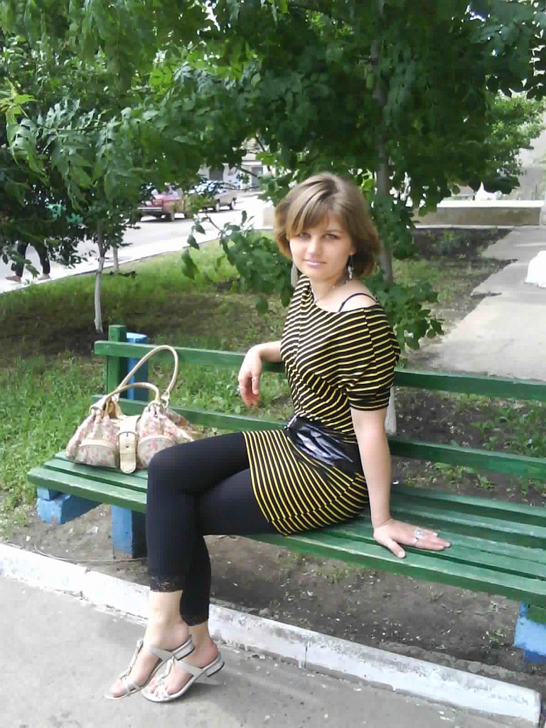 Студентка сидит в парке на скамейке и ждет когда к ней подойдут знакомиться. На ногах у нее черные лосины, а на теле полосатое платье желтого цвета. Погода так и шепчет в такой день - давай прогуляйся по парку.