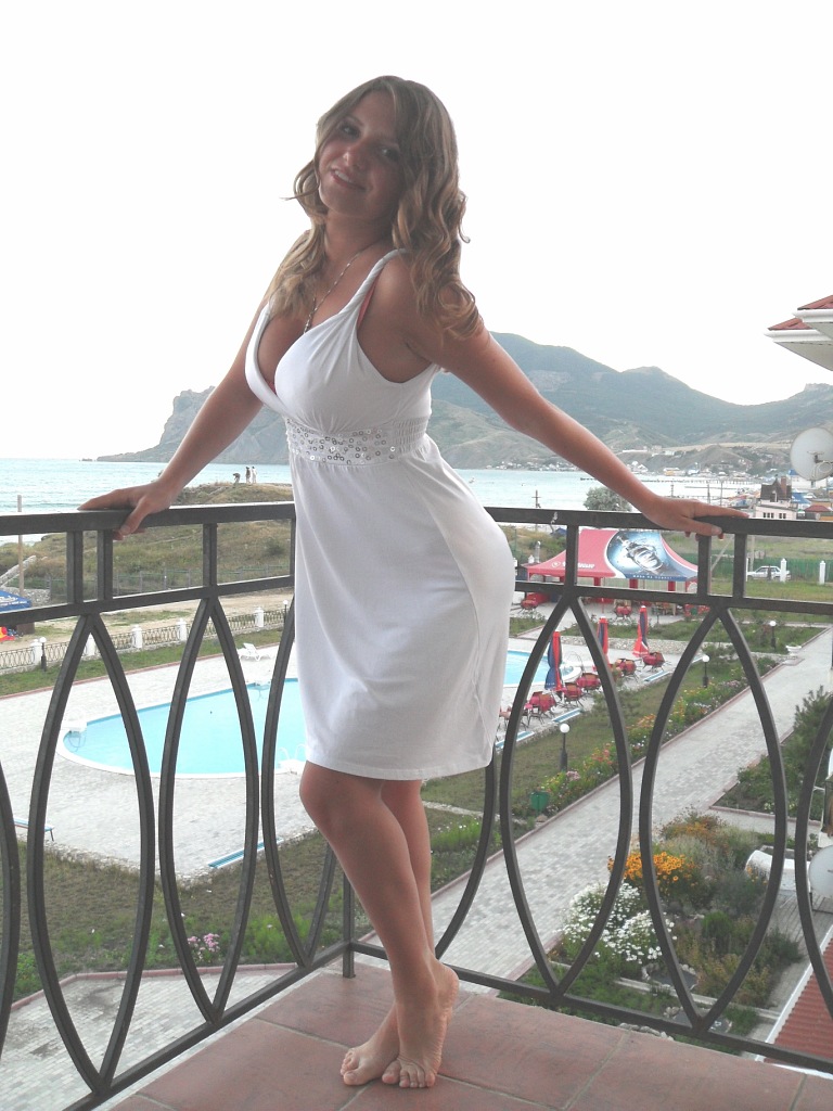 Девушка в белом легком платье развлекается, отдыхает на курорте. Рядом с ней огромный бассейн, в котором тоже можно искупаться. Вдали имеется пляж, где много отдыхающих и море, с его бесконечным горизонтом.