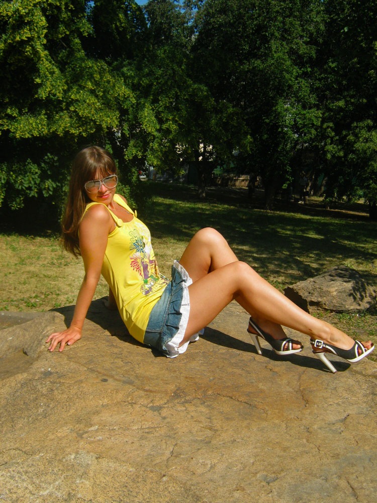 Девушка в желтой кофточке и джинсовой юбке на высоких каблуках и в солнечных очках присела травке. Сто процентов фотография будет на аватарке в социальной сети. Ноги у девушки искусят даже самого стойкого.