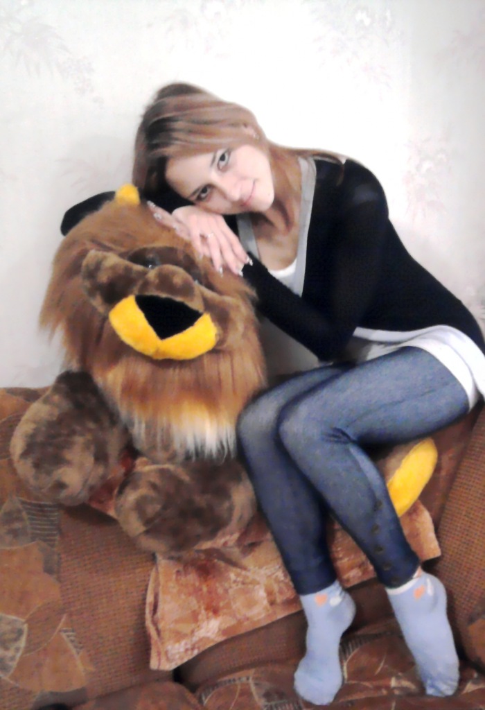 Девушка и ее коричневая плюшевая собака с желтым носом. Они любят друг друга, ведь эту собачку ей подарили мама с папой на день рождения. Прошу обратить внимание на женские ноги, они стройные и гладкие.