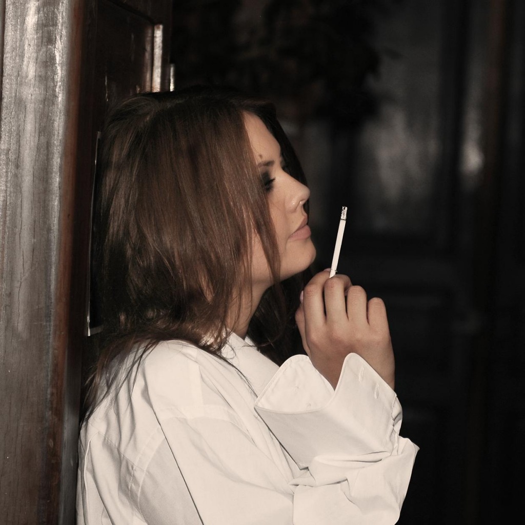 Накрашенная девушка держит сигарету в руках, стоит в белой кофточке и дымит. Вообще курить вредно, после этого обвисает грудь и кожа покрывается морщинами. Ну это еще в лучшем случае, в худшем отвалится рука или нога.