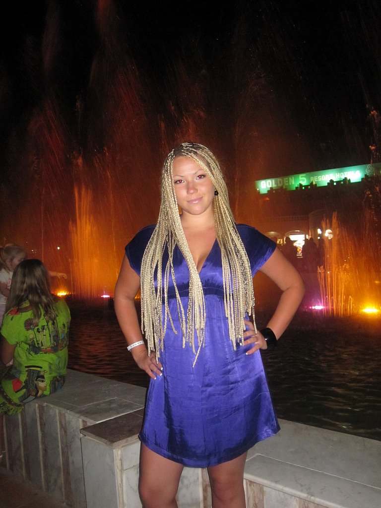 Толстая блондинка решила сфотографироваться у фонтана. Фонтан в ночи очень красивый и брызжет водой во все стороны. Приятно побывать ночью в таком месте, здесь находится много народа. Некоторые кидают в воду монеты, но непонятно зачем.