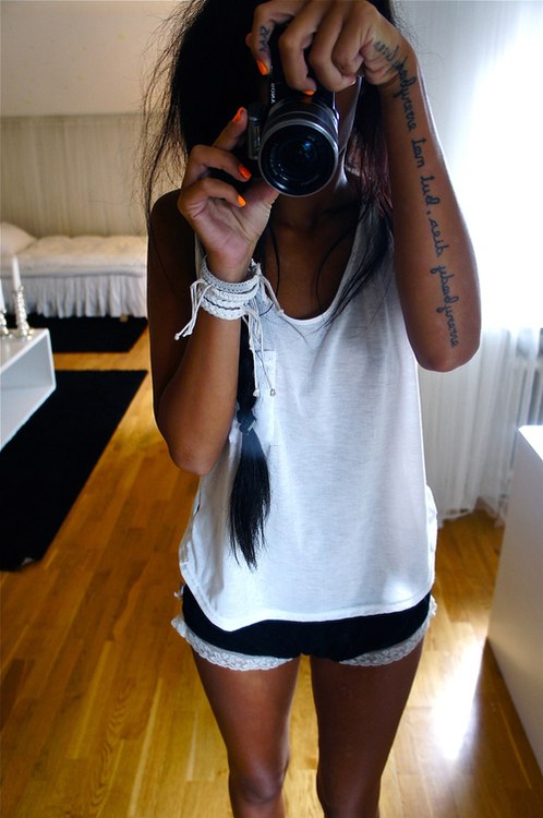 Девушка в белой майке и с татуировкой на руке стоит в своей комнате. У девушки загорелая нежная кожа и сейчас она пойдет на свидание. Ведь вечерами бывает очень скучно и прогуляться будет не лишним.