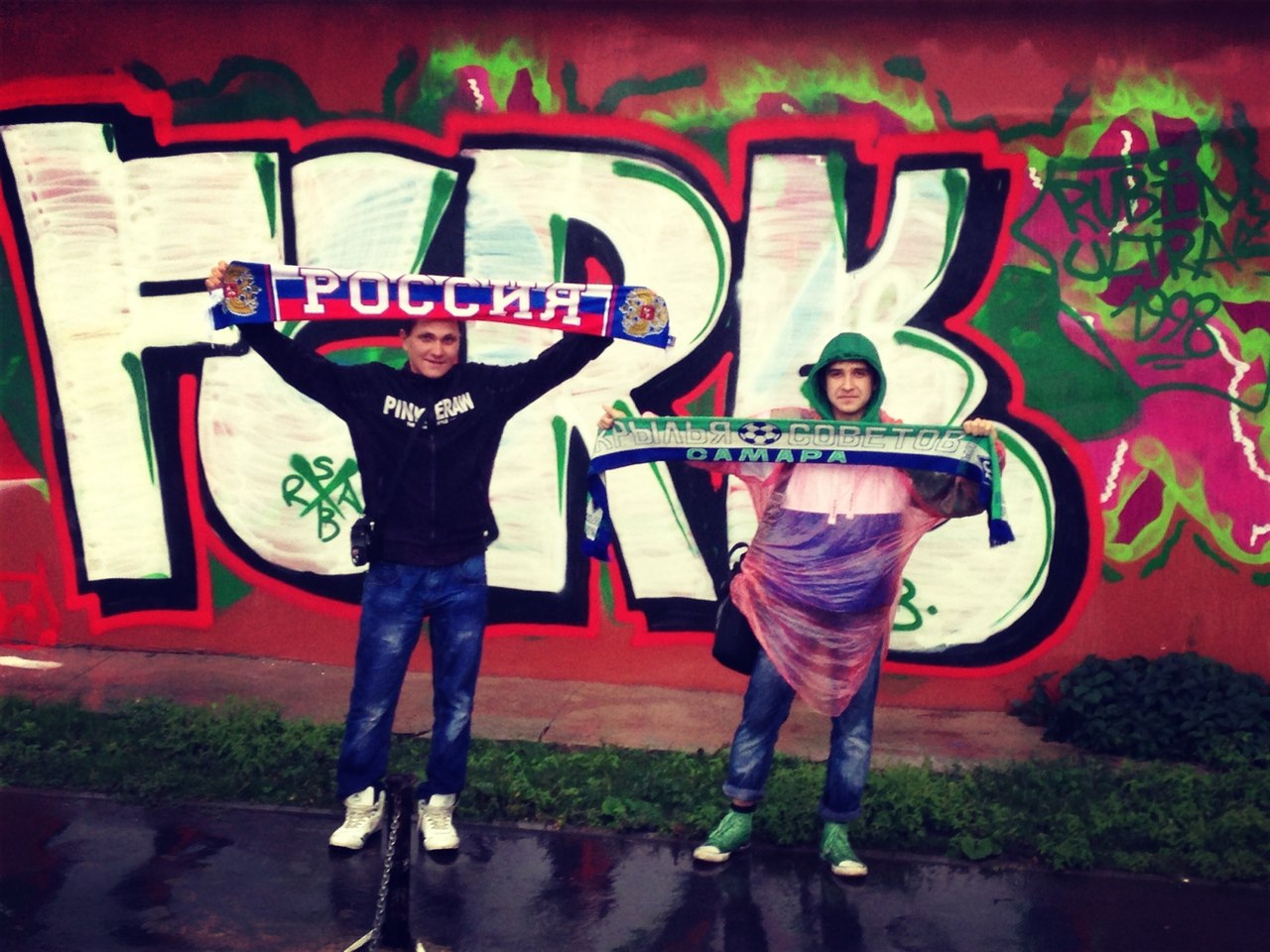 С шарфом Россия в руках стоят на улице два человека. Видно, что они хотят кого-то поддержать, поэтому они подняли руки вверх и шарфы тоже. Возможно, это болельщики футбольных команд и скоро будет решающий матч.