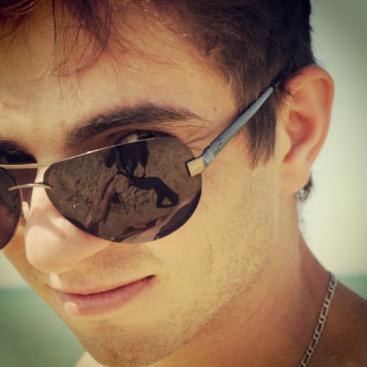Солнцезащитные очки и в них видно большое отражение. На фоне виднеется море, а может быть даже океан, а при такой жаркой и солнечной погоде очки явно не помешают.