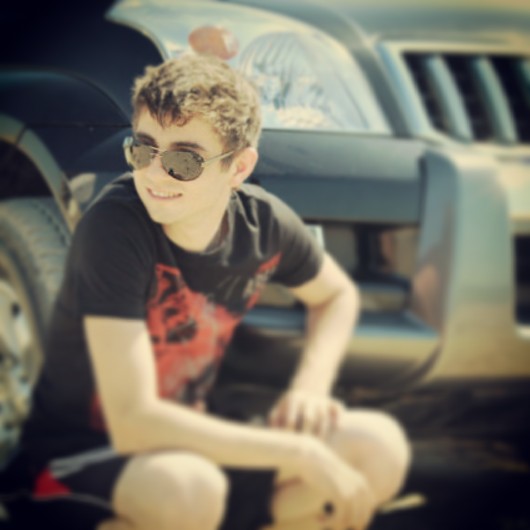 Кудрявый парень в очках присел рядом с крутым джипом и улыбается. Похоже, сегодня он поедет кататься с девчонками, ну или наоборот. В любом случае вечер намечается отличный.