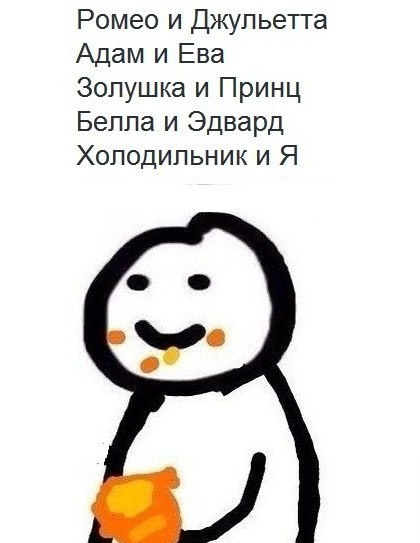 У Ромео есть Джульетта, у Адама есть Ева, у Золушки есть принц, у Беллы есть Эдвард, а у меня есть холодильник. И чем больше там еды, тем лучше для меня, ведь я люблю свой холодильник!