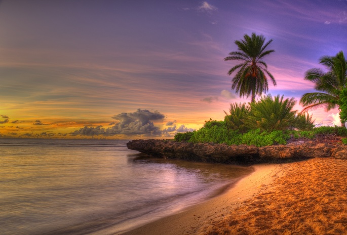 Очень красивый закат на острове в океане. Небо светится с разными оттенками, видны звезды и пушистые белые облака. Неописуемый закат, лучше посмотрите сами, сразу же захочется в то место.
