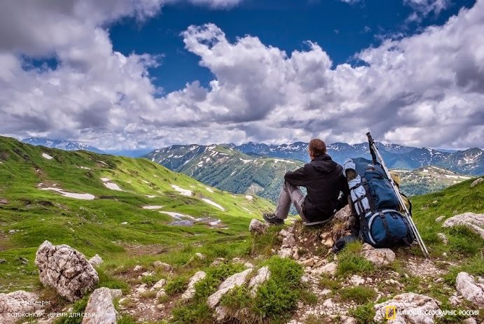 Высоко в горах одинокий путник решил сделать привал, он так высоко поднимался, чтобы полюбоваться горной природой и чистым небом. Здесь тишина, поэтому можно наслаждаться красотой этого мира спокойно.