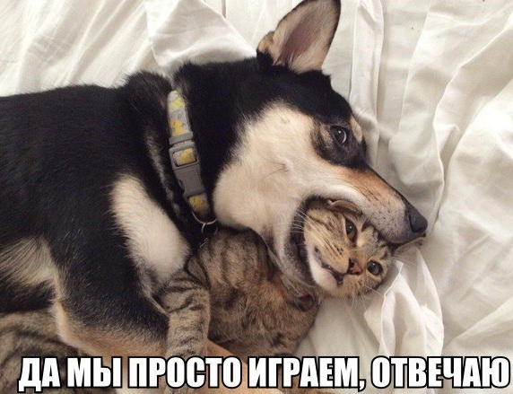 Собака кусает кошку, а точнее сказать кошка засунула свою голову в пасть большого животного. Главное чтобы собака не сжала свои челюсти. И все бы ничего, она еще отпирается, будто они просто играют.