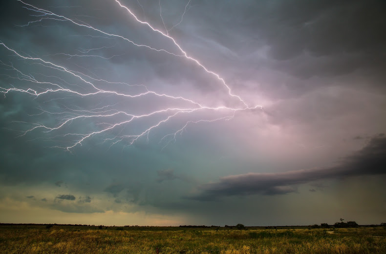 Молния сверкает в небе прямо над полем. Здесь пустынно и никого нет, только суслик редко может пробежать, и то в страхе спрячется, ведь молния - это сила. Несколько километров разряд проходит в воздухе, а за ним последует сильнейший гром.