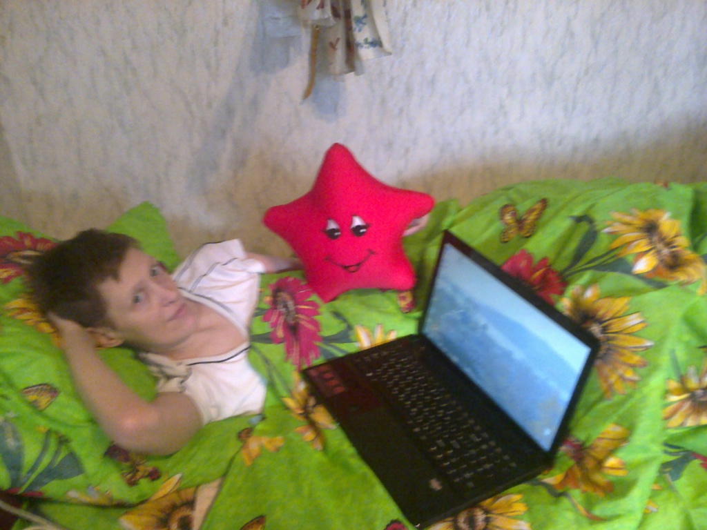 Девушка на зеленой кровати лежит с ноутбуком, а рядом с ней большая мягкая плюшевая звезда. И обе они улыбаются нам в камеру. Если наступает такой момент, что вам одиноко и некому вас развлечь, заходите к нам в чат и пообщайтесь - это здорово поднимает настроение.