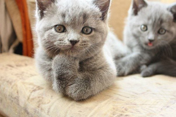 Серый котенок положил руку под свою голову, прямо как настоящий человек. Посмотрев в его глаза становится понятно, что он умный и вообще настоящий красавчик. За его спиной ползает еще один такой же серый товарищ, и вместе они что-то явно задумали. Возможно они просто ждут, когда их покормят.