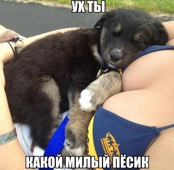 Этому милому песику явно не хватает любви и тепла, поэтому девушка решила пригреть его прямо на своей большой и красивой груди. Песик такому раскладу очень рад и он готов уже уснуть на этом мягком и теплом бампере. Некоторые пацаны даже могут ему позавидовать.