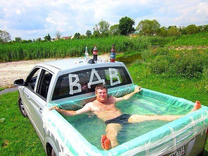 Парень отслужил в ВДВ и стал таким находчивым, что ему позавидовала бы сама Кондолизой Райс. Он додумался сделать бассейн в кузове своего автомобиля. Чтобы вода не протекала, он постелил полиэтиленовую пленку. Теперь можно наслаждаться теплой водой в движении и загорать одновременно.