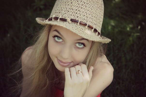 Милая девушка в плетеной шляпе гуляет на курорте, вот забрела в джунгли и сфотографировалась на память. Ее глаза запомнятся надолго, ведь они как у маленького котенка.
