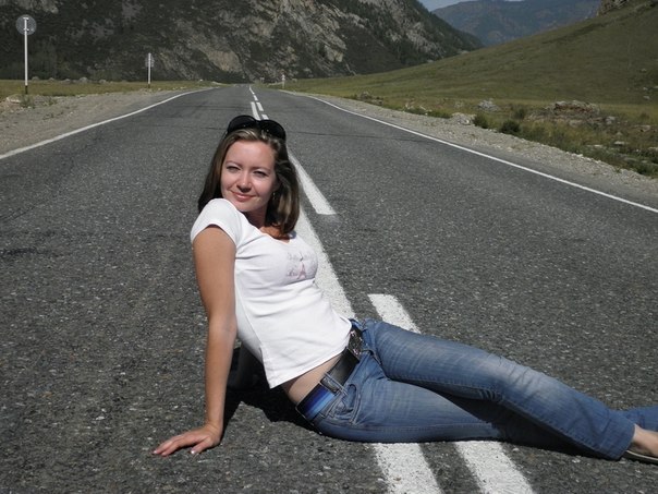 Шатенка лежит на асфальте, прямо по середине дороги. Осторожнее, ведь сзади всегда может неожиданно выехать автомобиль и это будет последнее фото. Поэтому совет на такой случай - смотрите по сторонам чаще.