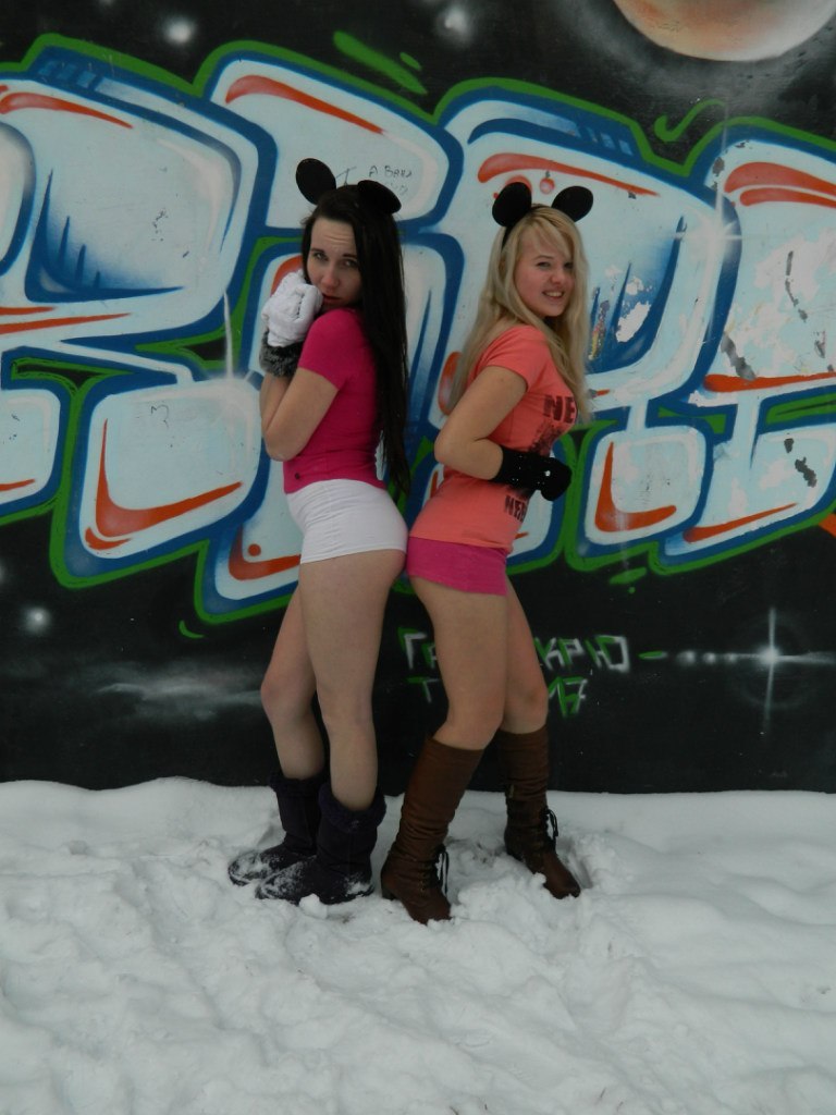 Девушки мышки надели теплые ушки, короткие шорты и пошли гулять по снегу. Девушкам мышкам вовсе не холодно, ну или они делают вид, что им тепло. Снега не очень много, скорее всего на улице поздняя осень.