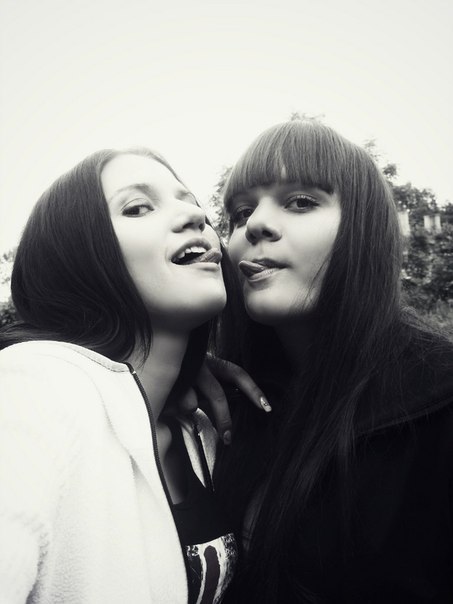 Две девушки облизывают друг друга и мило улыбаются, фотография черно-белая.