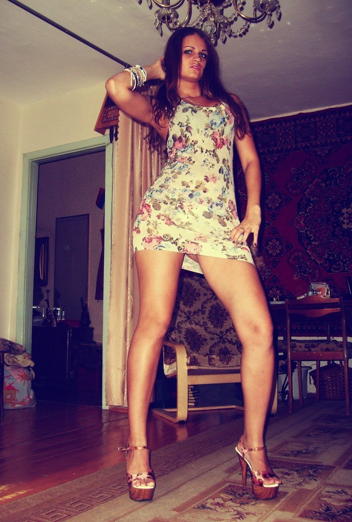 Что под платьем у этой милой и красивой девушки? Чтобы дать точный ответ нужно посмотреть, но подойти вряд ли кто осмелится, потому что сразу же получит по голове. Платье у нее с цветочками и сделано из мягкой приятной ткани.