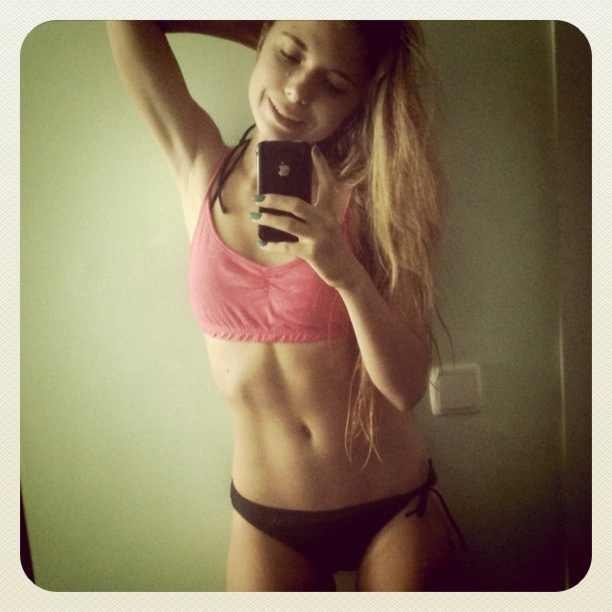 Четкая талия стройной блондинки. Она занималась спортом несколько лет и добилась желаемого результата, кубики на прессе хорошо видны и нет ни капли жира. Теперь у нее любимое занятие фотографировать саму себя в зеркале.